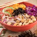 Imagem Meramente Ilustrativa. Cubos de peito de frango grelhados, gohan (arroz), mix de folhas verdes, uva passas, manga, tomate cereja, amendoim, nori, sunomono, cebola roxa, crispy de batata doce e gergelim.